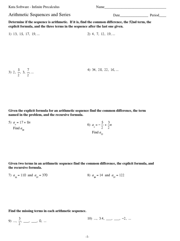 Never runs out of questions. Arithmetic Sequence Worksheets - Lesson Worksheets Worksheet by Kuta Software LLC Algebra 2 Arithmetic and Geometric Sequence Examples Name_____ e I2J0y1_5D nKHuOtka. 19 S m 1 4 5m2 4.